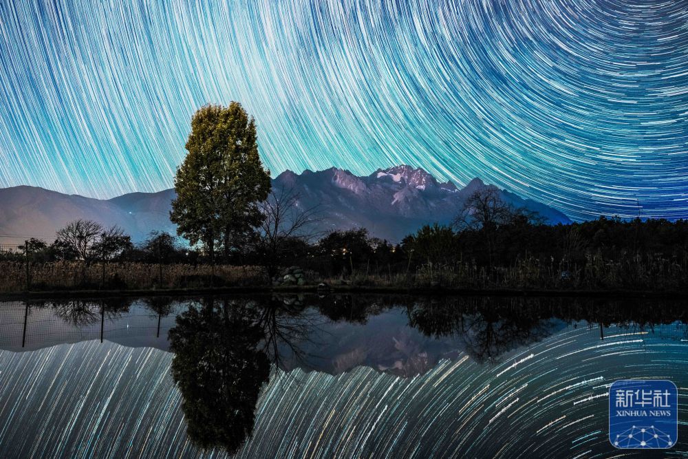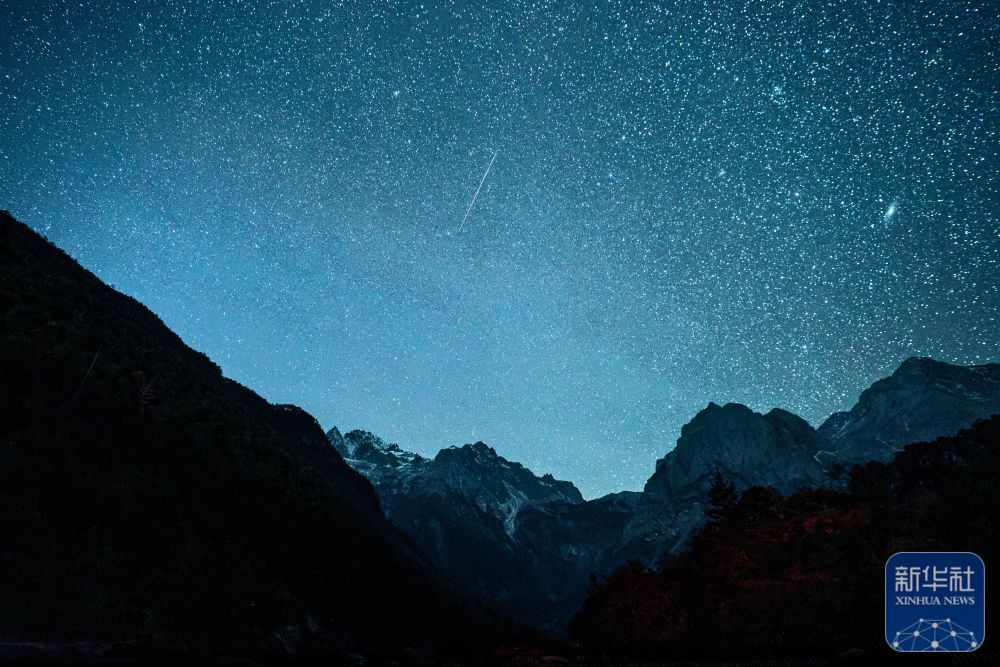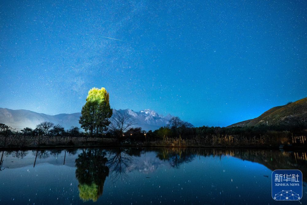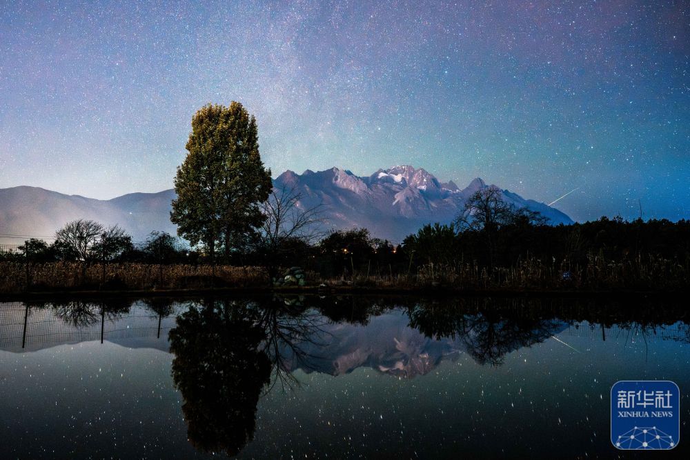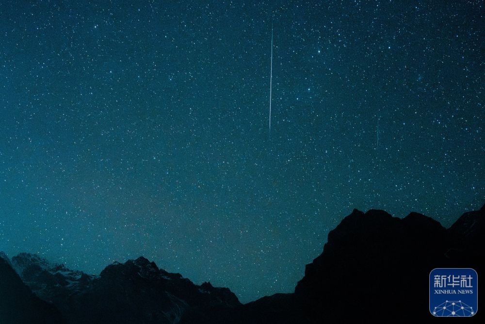 ↑ 12月14日凌晨在云南省丽江市玉龙雪山眼下拍摄的双子座流星雨。新华社记者 胡超 摄