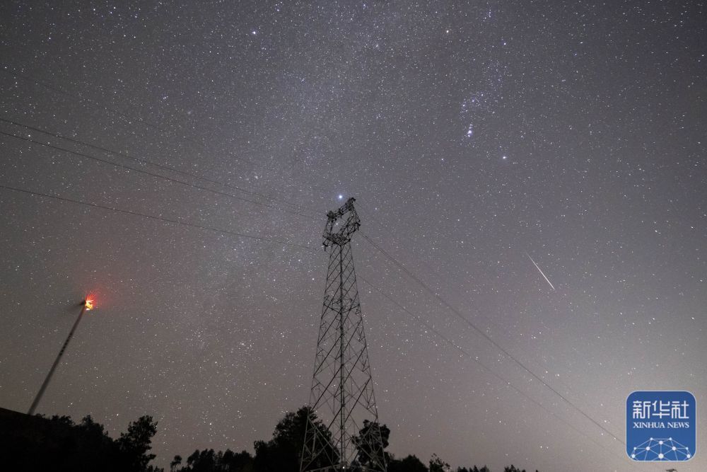 ↑ 12月14日在贵州省黔东南苗族侗族自治州从江县天鹅山拍摄的双子座流星雨。新华社发(吴兴科摄)