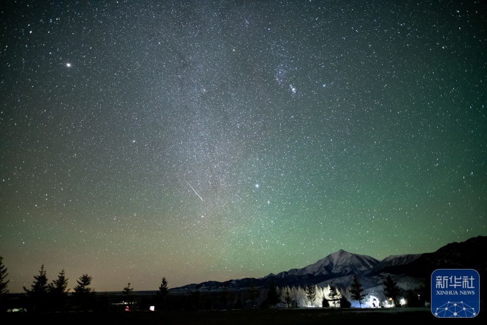 ↑ 12月13日在甘肃省张掖市民乐县扁王生齿拍摄的双子座流星雨。新华社发(钟晓亮摄)